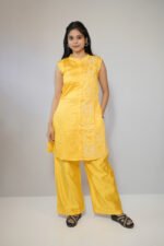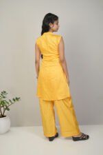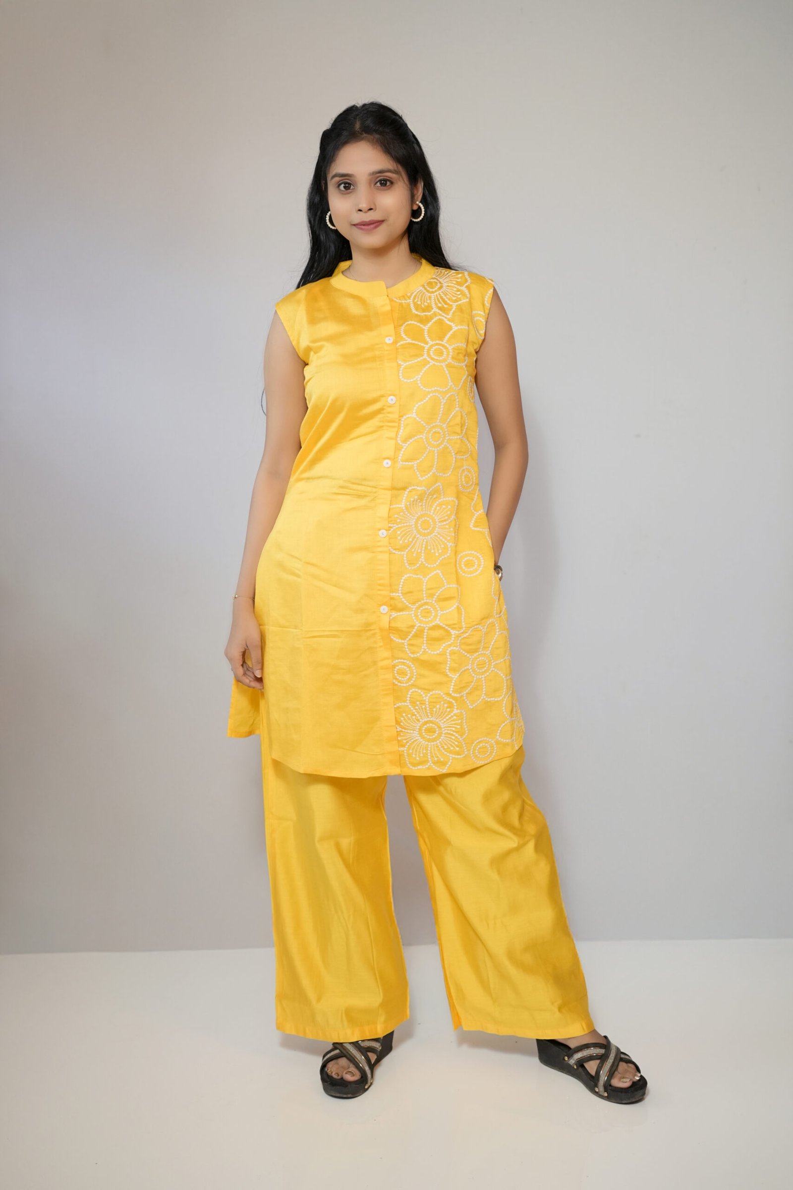 Step into elegance with this sleeveless sunshine yellow co-ord set featuring delicate floral embroidery. A perfect blend of comfort and charm.