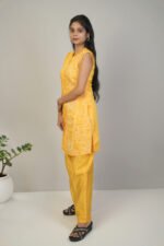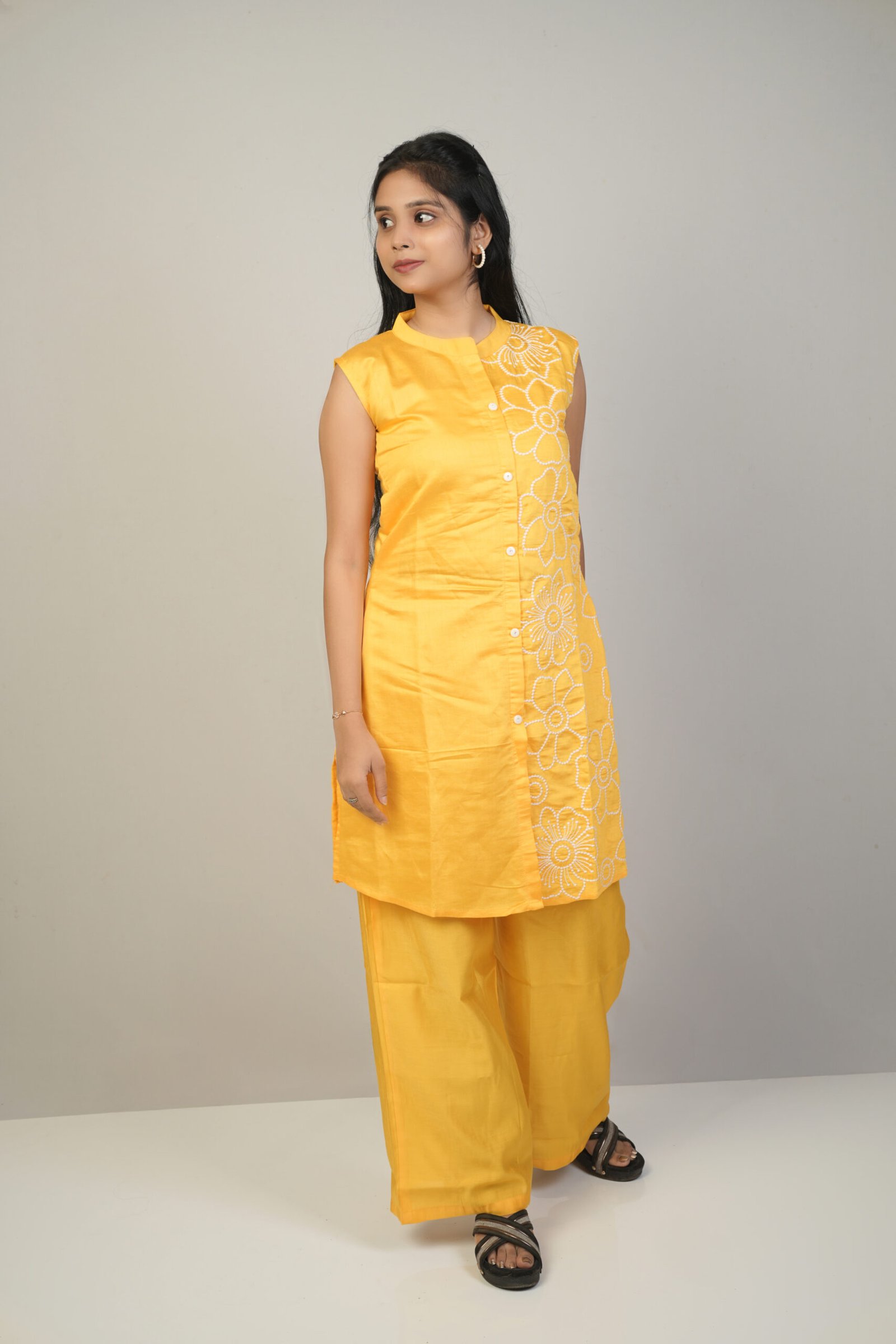 Radiate positivity and grace with this Sunshine Yellow Floral Embroidered Co-ord Set from Shree Kalika Fashion. Designed for the modern woman, the outfit features a sleeveless kurti with front-button styling and beautifully crafted floral embroidery along one side. Paired with matching relaxed-fit pants, this set adds a cheerful yet sophisticated vibe to your look.