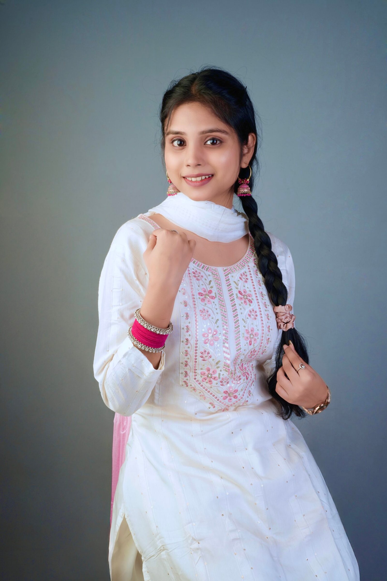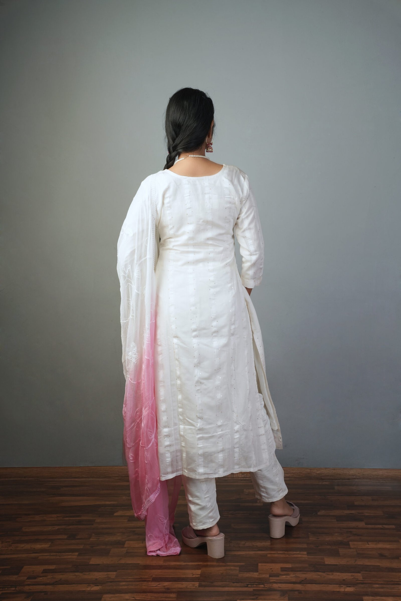 Radiate elegance in this White & Pink Thread Embroidered Suit Set from Shree Kalika Fashion. Crafted in a soft, breathable fabric, the set features delicate pink thread embroidery on a white base, exuding timeless grace. The suit is paired with matching white pants and a contrasting soft pink dupatta for a feminine touch.