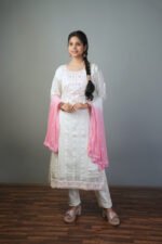 Elegant and serene, this white suit set with pink thread embroidery and dupatta adds charm to your festive and everyday ethnic wardrobe.